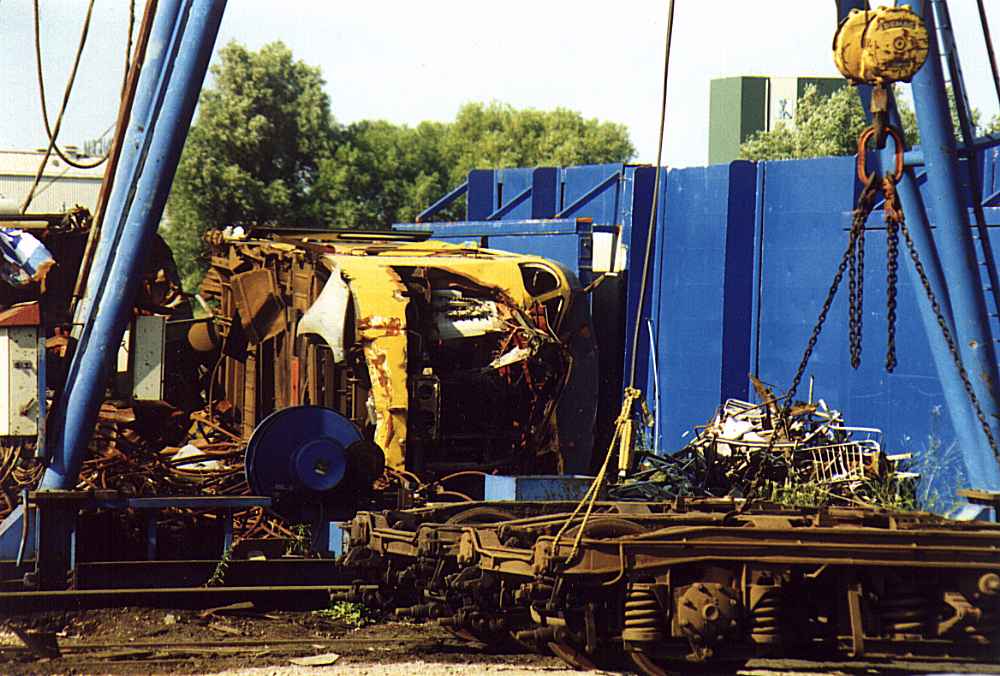 En zo moet het uiteindelijk allemaal eindigen: een hoop schroot waarin met enige moeite alleen nog een draaistelframe, een cabinedeur, een hoofdgenerator en een patrijspoort van een mBDk valt te herkennen.