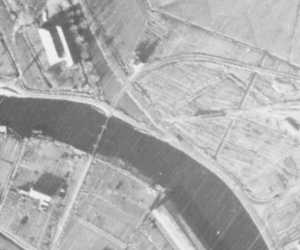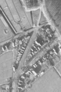 De NOLS-lijn boog af van de spoorlijn Delfzijl - Groningen waarvan rechtsboven nog net een gedeelte zichtbaar is. Bij 5 wordt het Damsterdiep overgestoken, bij 6 het oude Eemskanaal (te zien is dat de draaibrug hier is geopend). Opvallend is dat het lijkt of de spoordijk bij 7 deels is afgegraven om een doorgang te creëren, waarschijnlijk is dit ook een gevolg van de aanleg van verdedigingswerken door de bezetter. Na een draaibrug 8 over een afwateringskanaal volgt de halte Farmsum 9 ; op de vergroting is rechts nog net het stationskoffiehuis zichtbaar. De spoorlijn liep hierna verder in zuidelijke richting (zie hiervoor ook de pagina over Weiwerd). Behalve twee spoorlijnen is ook nog een deel van de tramlijn Delfzijl - Winschoten te zien. Deze liep vanaf het centrum van Delfzijl eerst een eind in zuidwestelijke richting om vervolgens het Damsterdiep 10 en Eemskanaal 11 over te steken. In Farmsum 12 was er voor de tram een halte en een passeerspoor. Doorrijdend in zuidelijke richting werd even later een boerderij 13 gepasserd die lag ingeklemd tussen de spoorlijn van de NOLS en de tramlijn van de OG. De boerderij bestaat nog steeds, maar ligt tegenwoordig vlak naast het punt waar het Oosterhorn-kanaal uitkomt op het nieuwe Eemskanaal. Opvallend zijn tenslotte nog enkele groepjes langwerpige gebouwen bovenaan de foto's 14. Dit zijn enkele van de vele tientallen steenfabrieken die Groningen vroeger telde. Er zijn in deze omgeving nog veel huizen te vinden die zijn gebouwd met de typische rode bakstenen die door deze fabrieken werden gemaakt. Beweeg de muis over de rood omlijnde gebieden om deze vergroot te bekijken!