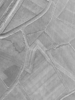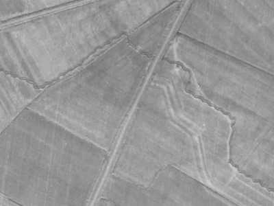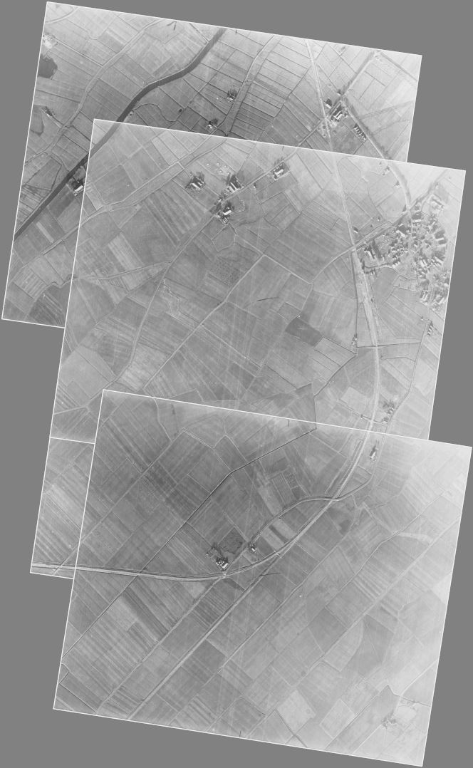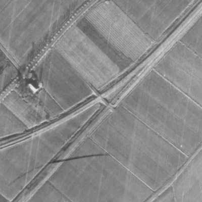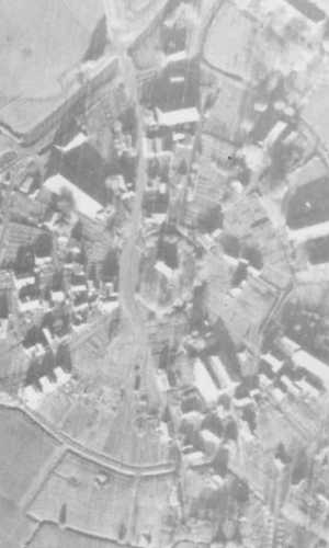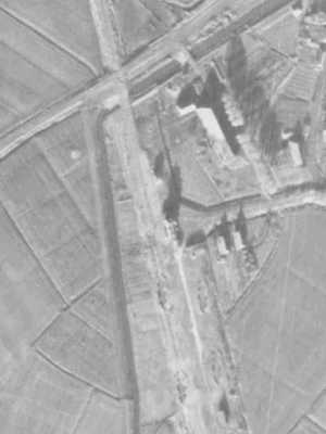 Ook in het lege landschap te zuiden van Delfzijl waren door de Duitsers diverse verdedigingslinies aangelegd 1 2. Rechtsboven op de foto is de typische wiel-structuur van het op een wierde gebouwde dorp Weiwerd 3 goed zichtbaar. De tram naar Winschoten reed vlak langs de in het middelpunt gelegen kerk, om vervolgens in zuidoostelijke richting de foto te verlaten. De kerk en een groot deel van de op de foto zichtbare huizen werden in de jaren zestig gesloopt om ruimte te maken voor een uitbreiding van het industriegebied van Delfzijl. Ten westen van het dorp lag het station van Weiwerd 4 aan de spoorlijn naar Zuidbroek. Op de vergroting is duidelijk de lange schaduw van het hoge stationsgebouw zichtbaar. Het gebouw werd aan het eind van de oorlog door de Duitsers gebruikt als uitkijkpunt en raakte mede daardoor onherstelbaar beschadigd bij de bevrijdingsacties rondom Weiwerd. Ongeveer twee kilometer ten zuiden van het station is het punt zichtbaar waar de pas later aangelegde Woldjerspoorlijn aftakte 5 van de lijn naar Zuidbroek. De opbraak van het spoor ging min of meer in dezelfde volgorde als de aanleg: in 1936 werd het spoor vanaf dit punt tot aan Zuidbroek opgebroken, in 1942 volgde het resterende NOLS-spoor en de Woljerspoorlijn. Aangezien deze foto's in november 1944 werden genomen is hierop dus alleen nog de kale spoordijk te zien. Beweeg de muis over de rood omlijnde gebieden om deze vergroot te bekijken!