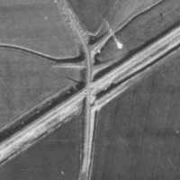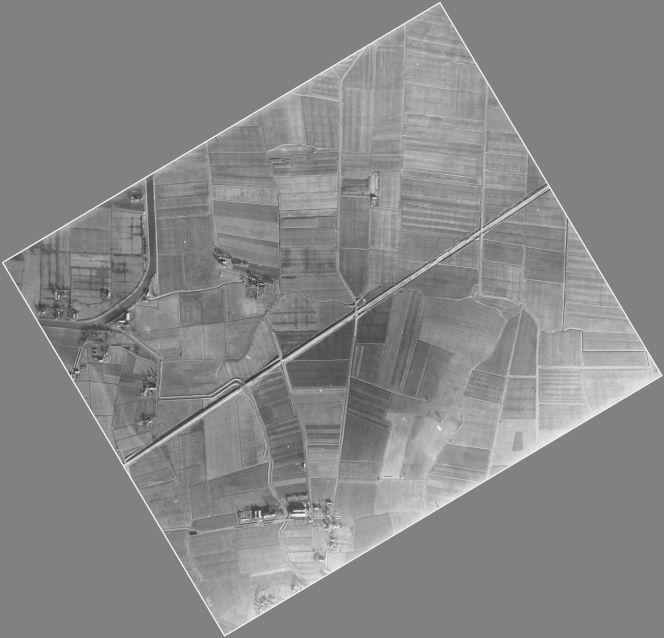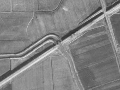 De foto is bij een laagstaande winterzon genomen waardoor elke verhoging in het landschap duidelijk zichtbaar is, met name de toeritten naar de brug over de Wagenborgermaar 1. Net als op veel andere plekken rond Delfzijl waren hier door de bezetter allerlei verdedigingswerken aangelegd. Te zien is onder andere dat de dijk direkt naast het westelijke landhoofd gedeeltelijk is afgegraven, terwijl deze een eindje rechts van de brug juist is opgehoogd. Ook met de brug zelf is iets vreemds aan de hand: aan de noordkant lijkt het gewoon een draaibrug in geopende stand, maar aan de zuidkant lijkt er geen einde aan de brug te komen! Bij 2 is aan de opritten vanaf de diverse akkers goed te zien hoe hoog het spoor hier nog boven het maaiveld lag. Op de spoordijk is direkt naast de overweg een diepe kuil zichtbaar, waarschijnlijk ook onderdeel van de Duitse versterkingen (de zwarte lijn daarboven is overigens geen schaduw maar een beschadiging van de foto, net als de witte vlek rechtsboven). Beweeg de muis over de rood omlijnde gebieden om deze vergroot te bekijken!