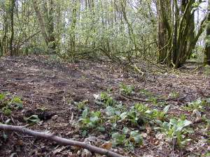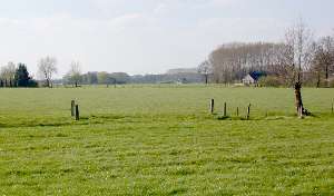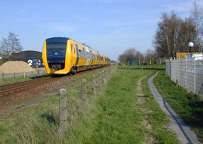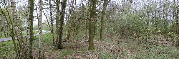 Aan de overkant van de weg is een groepje bomen te zien, waaronder opmerkelijk veel berken; wie wel vaker oude spoorlijnen heeft gezien, weet dan wel hoe laat het is! Tussen de bomen is de spoordijk over een lengte van zo'n 100m nog vrij duidelijk te zien, maar verdwijnt daarna opnieuw spoorloos tussen de weilanden.