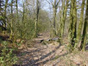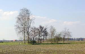 Via een omtrekkende beweging kom ik ongeveer een kilometer verderop bij een groepje bomen aan dat hier langs de kant van de weg staat, of eigenlijk is het meer een klein stukje bos van misschien een halve hectare. Volgens de kaart zou de spoorlijn hier schuin doorheen moeten hebben gelopen, maar op het eerste gezicht is daar niets van te zien. Er ligt wel een zandpad dat naar een akker loopt, maar de richting daarvan klopt zeker niet met de ligging van de spoorlijn. Waar lag dat ding dan wel? Ik besluit maar eens een nader onderzoek in te stellen en werk me omzichtig tussen de takken en struiken door...