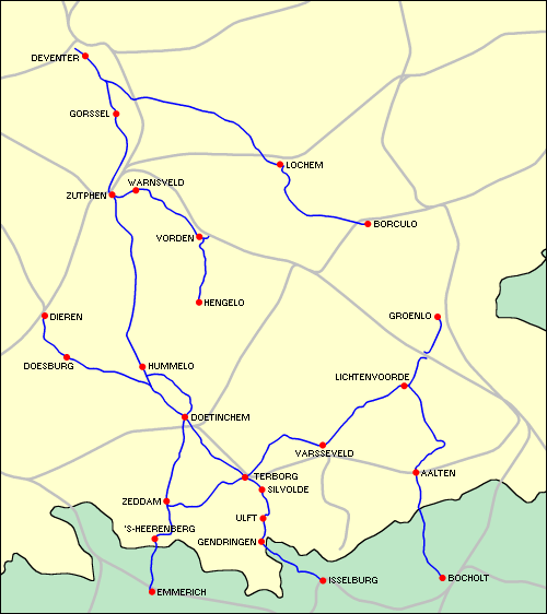 Op de kaart hiernaast is te zien waar er in de Achterhoek en de Graafschap stoomtrams hebben gereden (niet ingetekend is de GSM-lijn van Dieren richting Velp). De aanleg (behalve bij de GT) en exploitatie werd door de volgende zes maatschappijen uitgevoerd: