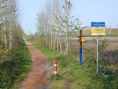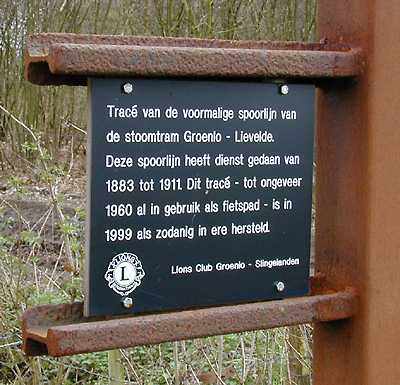Naast het pad staat een bord dat -geheel in stijl- is bevestigd aan twee (zeer roestige) stukken smalspoorrail met daarop een korte toelichting op de naam 'Trampad'. Blijkbaar was men niet op de hoogte van het bestaan van de NV 'Groenlosche Tram' want er wordt gesuggereerd dat er hier na 1911 geen trams meer hebben gereden...