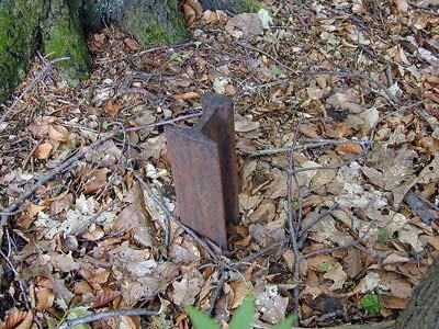 Verscholen tussen de bomen is hier naast het pad eindelijk een tastbaar overblijfsel van de GOSM te vinden: een oud roestig stuk tramrail steekt tussen de bladeren uit de grond! Bij de spoorwegen werden afgedankte stukken rail wel vaker bij wijze van markering naast het spoor in de grond geslagen, maar kennelijk werd dit ook bij de GOSM gedaan. Het is op de foto natuurlijk moeilijk te zien, maar dit stuk rail is inderdaad ook van een duidelijk kleiner type dan wat bij (lokaal)spoorlijnen werd toegepast.