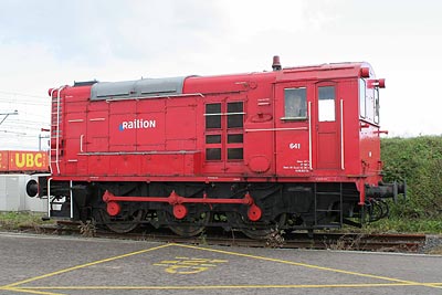 01-10-2005In juli 2002 werd de terzijde gestelde dieselelektrische rangeerlocomotief 641 van de werkplaats Feijenoord in Rotterdam overgebracht naar het rangeerterrein Kijfhoek. De 641 werd hier bij het hoofdgebouw als statisch objekt neergezet. Bijzonder is de rode Railion-kleurstelling waarin de 641 werd geschilderd: de 600'en hebben in de aktieve dienst namelijk nooit in deze kleuren rondgereden. (Foto: Harold van Eupen) De 641 heeft zijn eerste lustrum op de Kijfhoek net niet gehaald: op 2 april 2007 werd de locomotief per dieplader afgevoerd naar sloper Hoeben in Hasselt. |