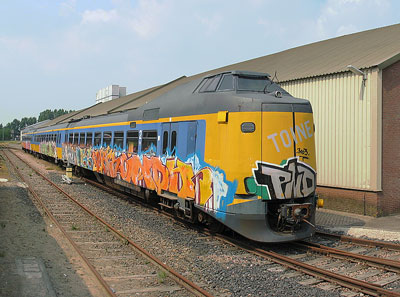 23-07-2006Tegen het einde van 2003 kwam er een einde aan de inzet van de Koplopers uit de protoserie ICM-0 (4001-4007). Voor het oudste stel, de 4001, kwam het einde toen deze op 10 augustus 2003 met een defect aan de kant werd gezet. Ook de meeste andere ICM-0 stellen werden naar aanleiding van een mankement of verlopen onderhoudstermijn buiten dienst gesteld. Alleen de 4003 wist het nog vol tot te houden tot de omloopwijziging van 14 december. Na een verblijf van ruim een jaar bij het onderhoudsbedrijf in Onnen werd de 4001 op 26 oktober 2004 overgebracht naar het industrieterrein "De Kleefse Waard" waar het als oefenobject voor de bedrijfsbrandweer van de AKZO dienst doet. De naam "Toine" op de neus is vermoedelijk niet door vandalen aangebracht, maar een verwijzing naar de begintijd van ICM-0. In die jaren waren de stellen namelijk ook voorzien van (officieuze) namen op de kopdeuren, maar dan wel in een aanzienlijk kleiner lettertype dan hier gebruikt is. |