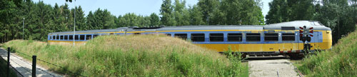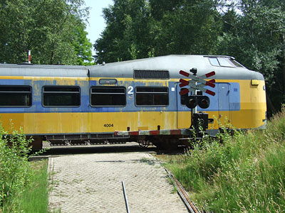 01-07-2009In 2003 kwam er een einde aan de inzet van de protoserie ICM-0, bestaande uit de treinstellen 4001-4007. Deze serie stamt uit 1977, terwijl de overige Koplopers pas in de periode 1984-1994 werden afgeleverd. Omdat ICM-0 bovendien op veel punten afweek van de latere series werd besloten dat deze stellen niet meer in aanmerking kwamen voor een grote revisie. Vanaf de zomer van 2003 kon elke verlopen onderhoudstermijn en elk groter defect voor een treinstel het einde betekenen. De 4004 werd op 26 november 2003 in het onderhoudsbedrijf in Onnen terzijde gesteld wegens versleten wielstellen. Net als bij de 4001 en 4005 betekende dit echter niet dat het stel ook spoedig gesloopt zou worden. Na een verblijf in Onnen van bijna een jaar werd de 4004 op 5 november 2004 naar Bergen op Zoom gesleept. Bij de spooraansluiting van Philip Morris werden de rijtuigen de volgende dag overgeladen op een dieplader, en naar de Politieacademie in Ossendrecht overgebracht. Hier werd het treinstel in twee delen op een stuk dubbelspoor geplaatst om zo als oefenobject te dienen. Behalve het spoor van ruim honderd meter lang is hiervoor ook nog een overweg, een perron en een klein station nagebouwd.